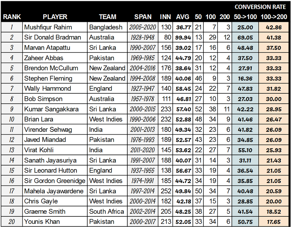 What About Test Batsmen By Conversion Rate of Hundred To Double Hundred (min. 3 200s)?